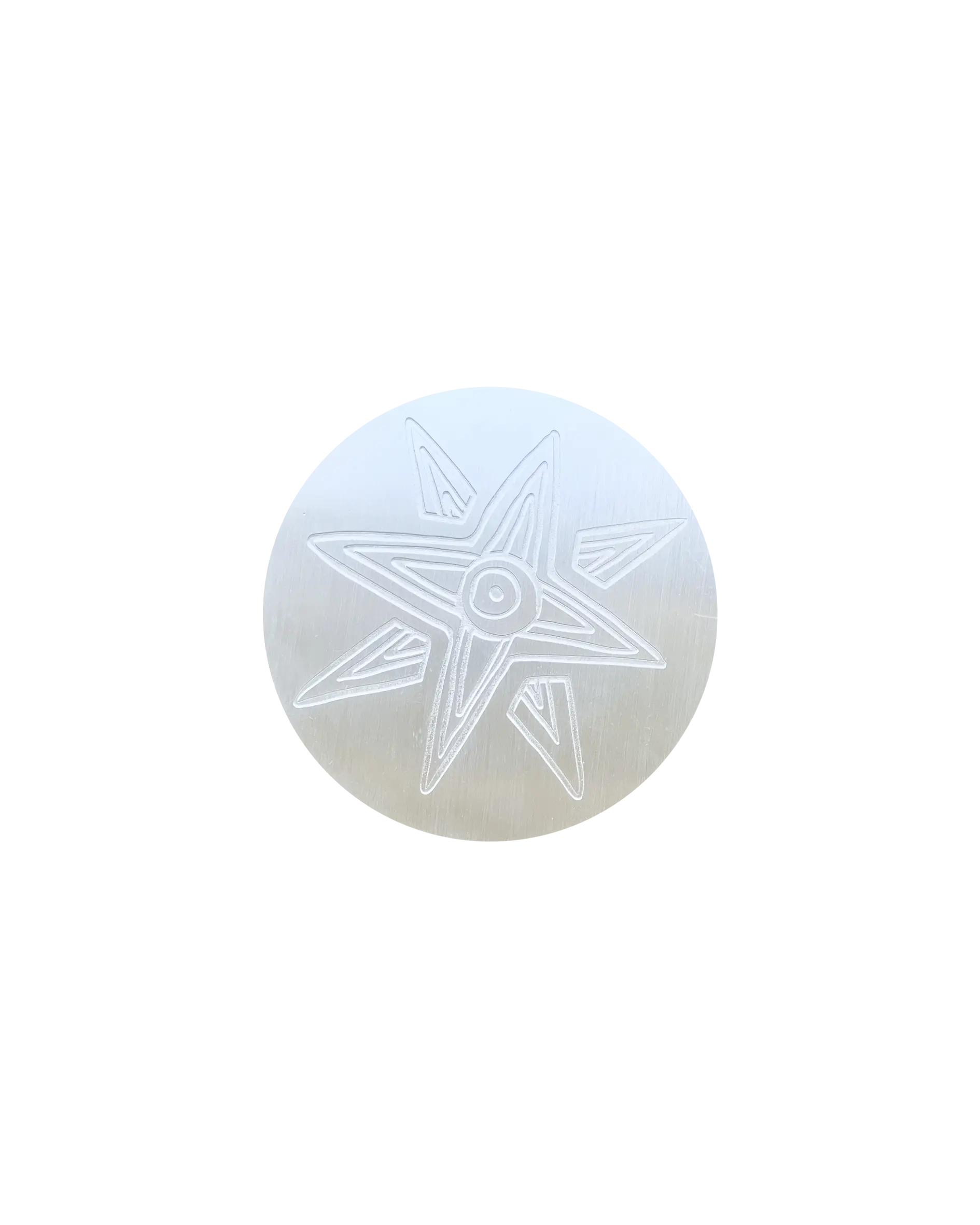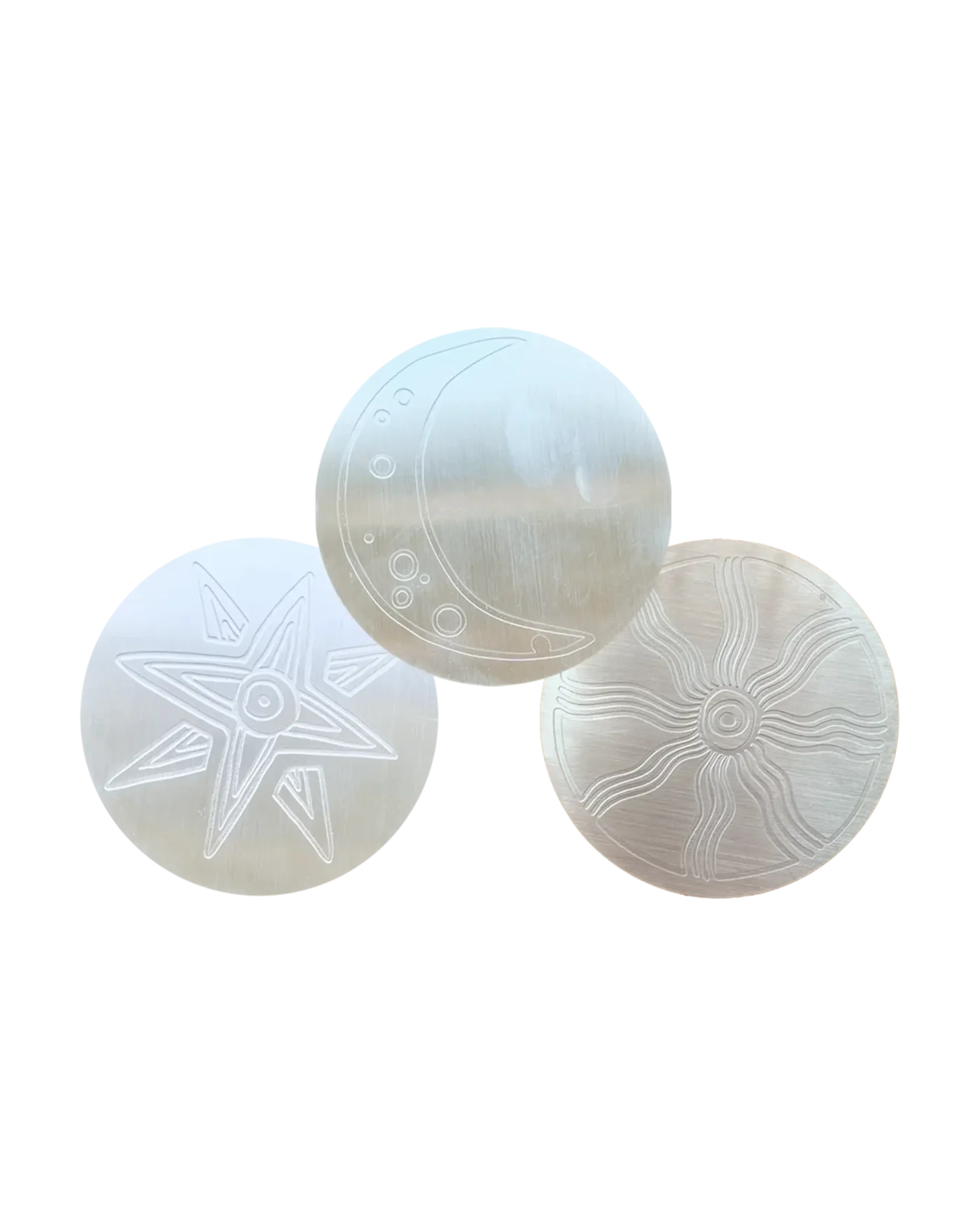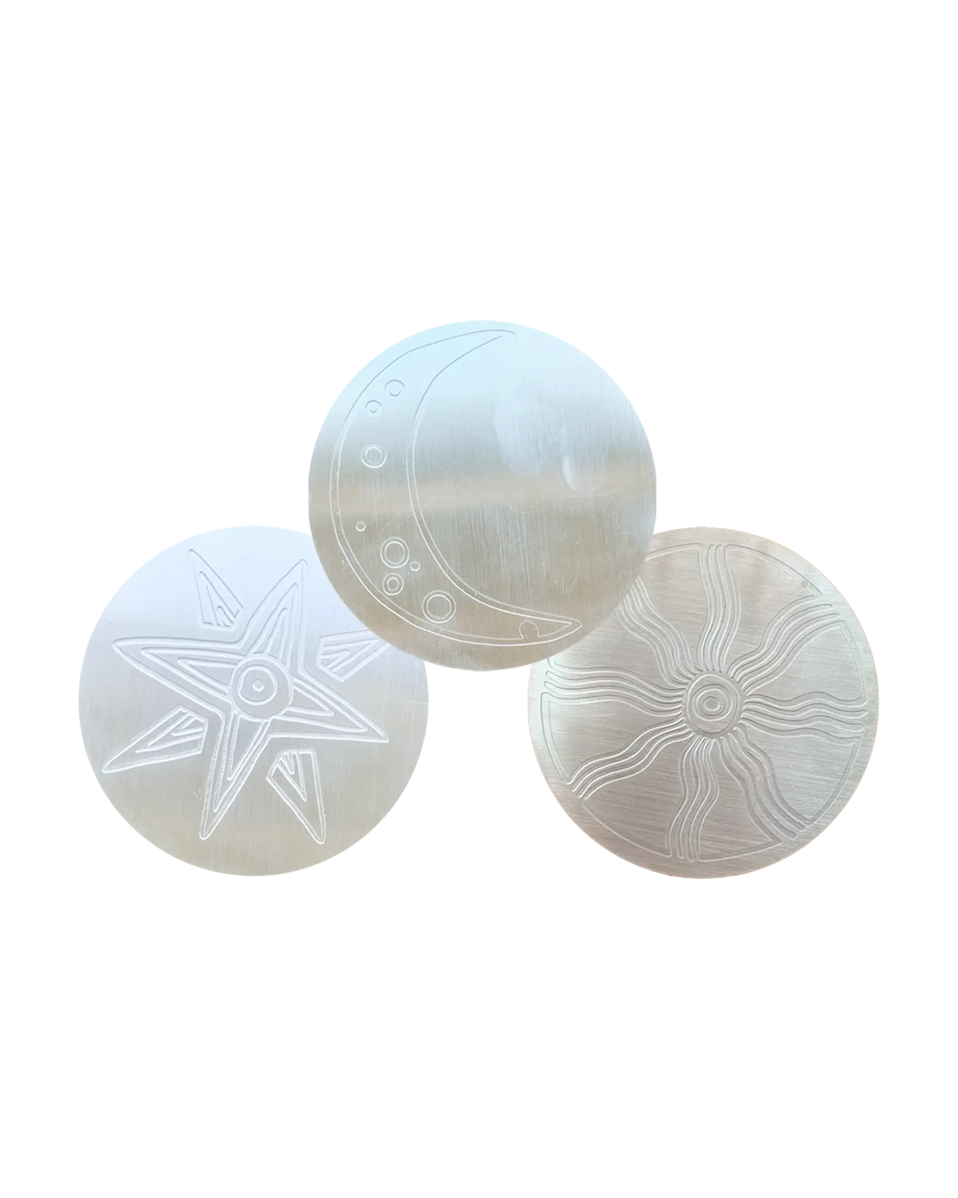 Set of six ASTRES mixed coasters representing Phoenician stars Shapsh (Sun), Tanit (Moon) and Astarte (Star)on brass. They come in a small textile pouch.