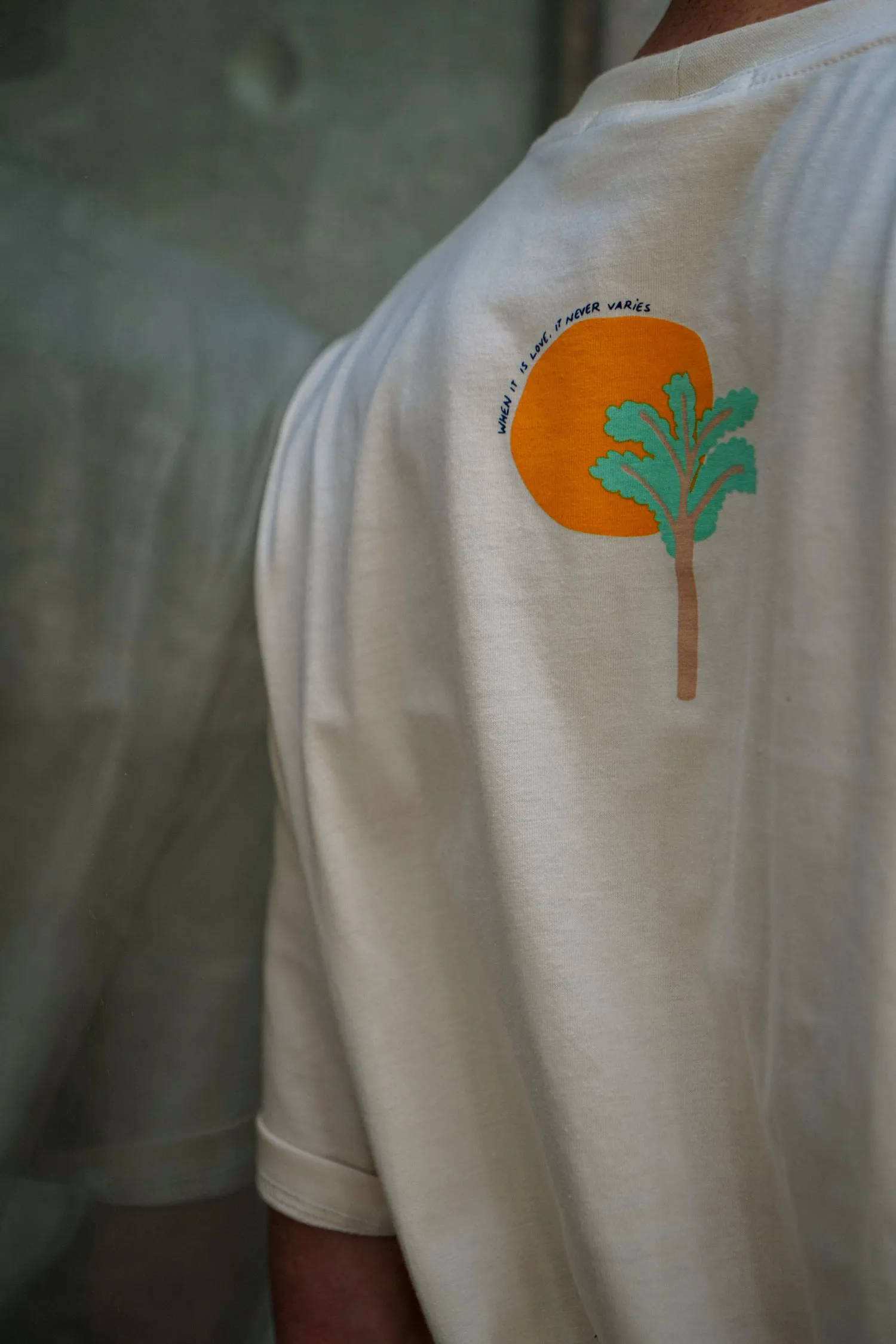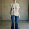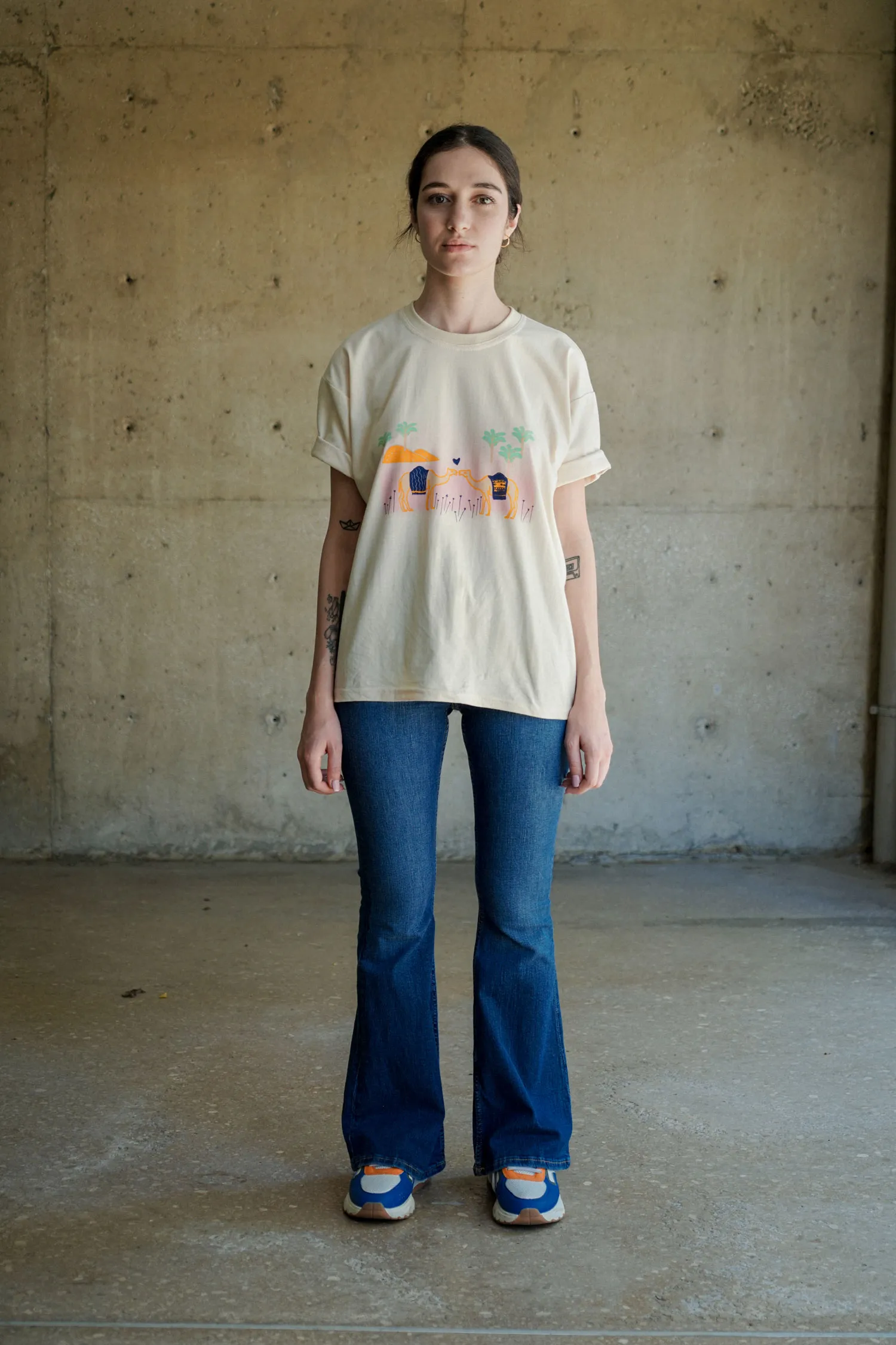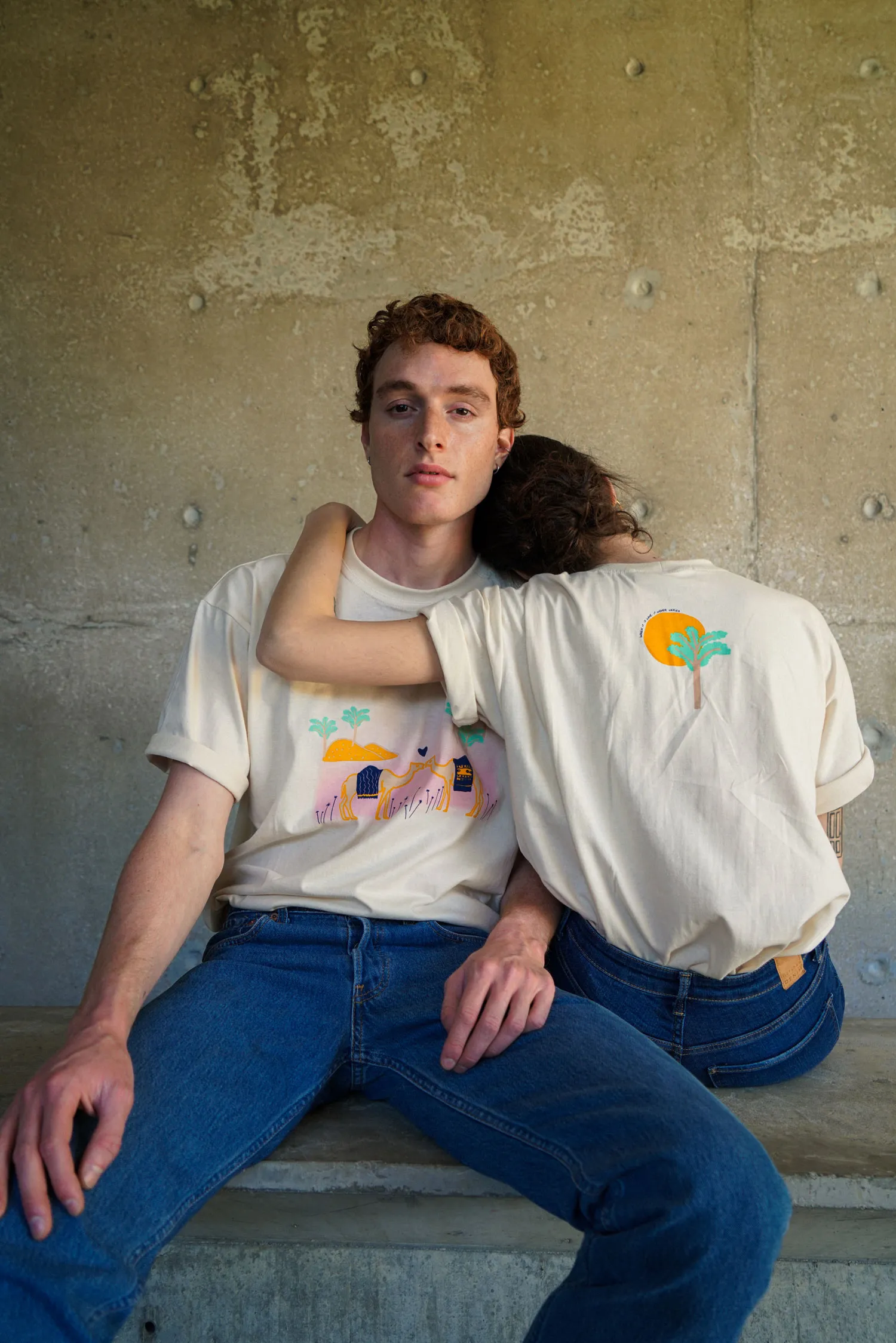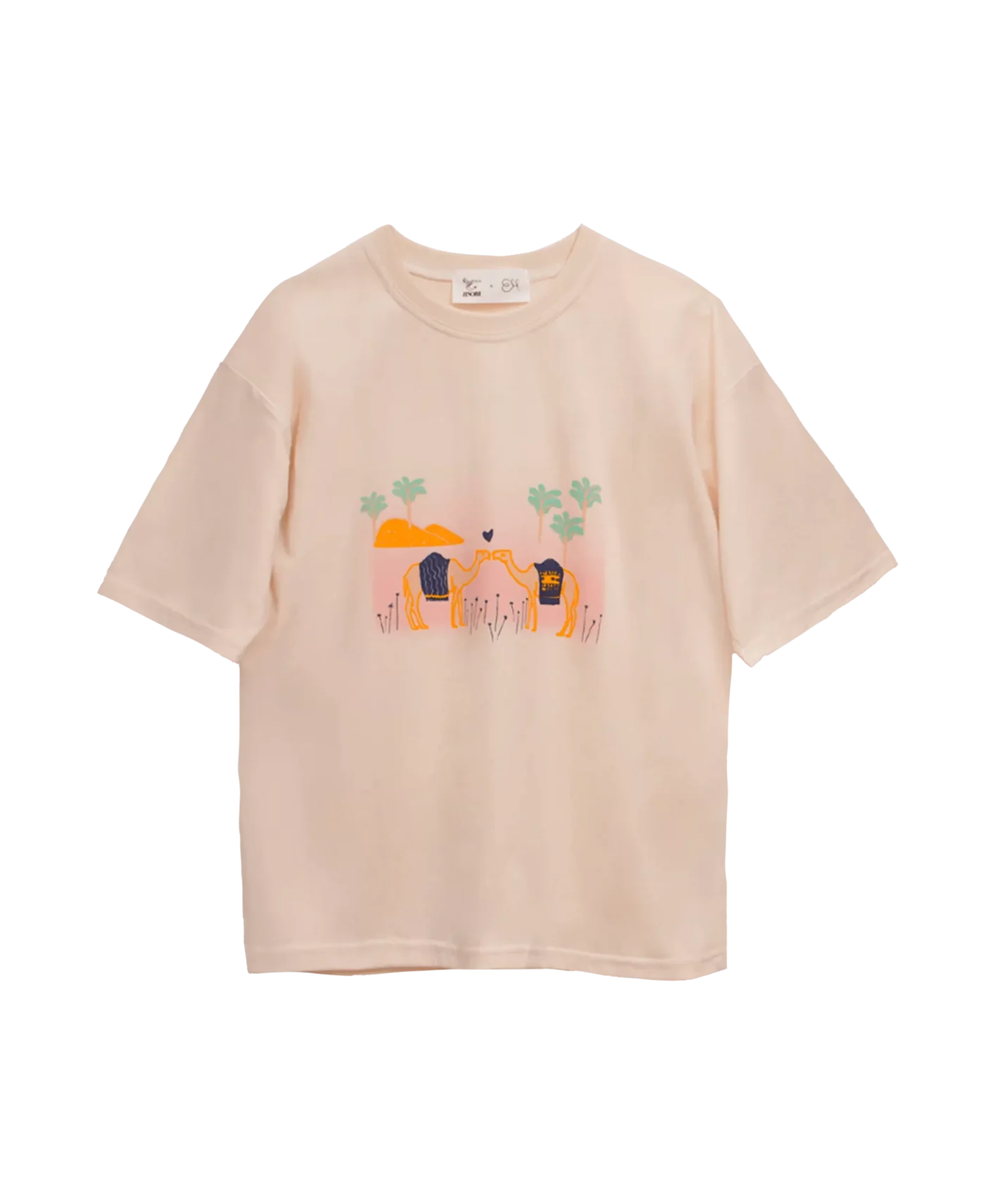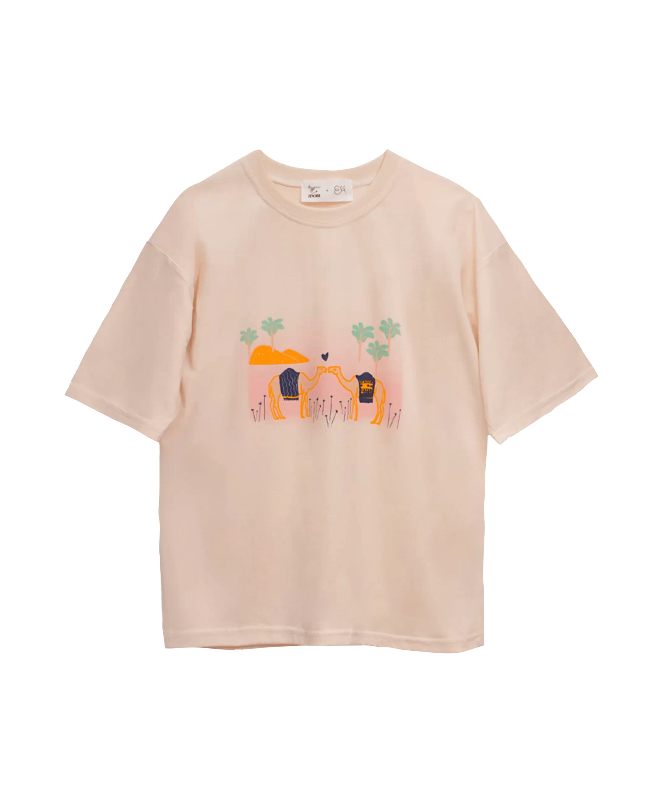 Dromamour Tee is reproduced from Zenobie’s Sur le nil collection, featuring a romantic and quirky scene between two camels. It is hand printed in a silkscreen atelier in Beirut. The sentence on the back reads When it’s love, it never varies.