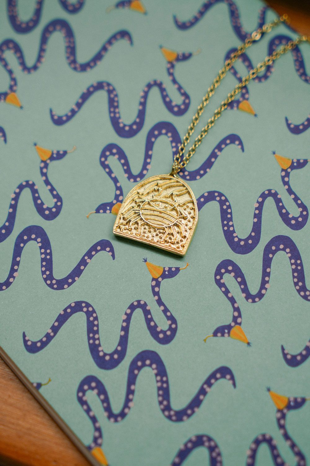 Cancer pendant is part of our illustrated Zodiac inspired by ancient and medieval drawings. Each necklace is engraved and assembled manually,  and it is coupled with a gold plated chain of 30cm long. We’ve also engraved the sentence We’re all made of stars on the back, therefore reminding us that we’re all connected.
