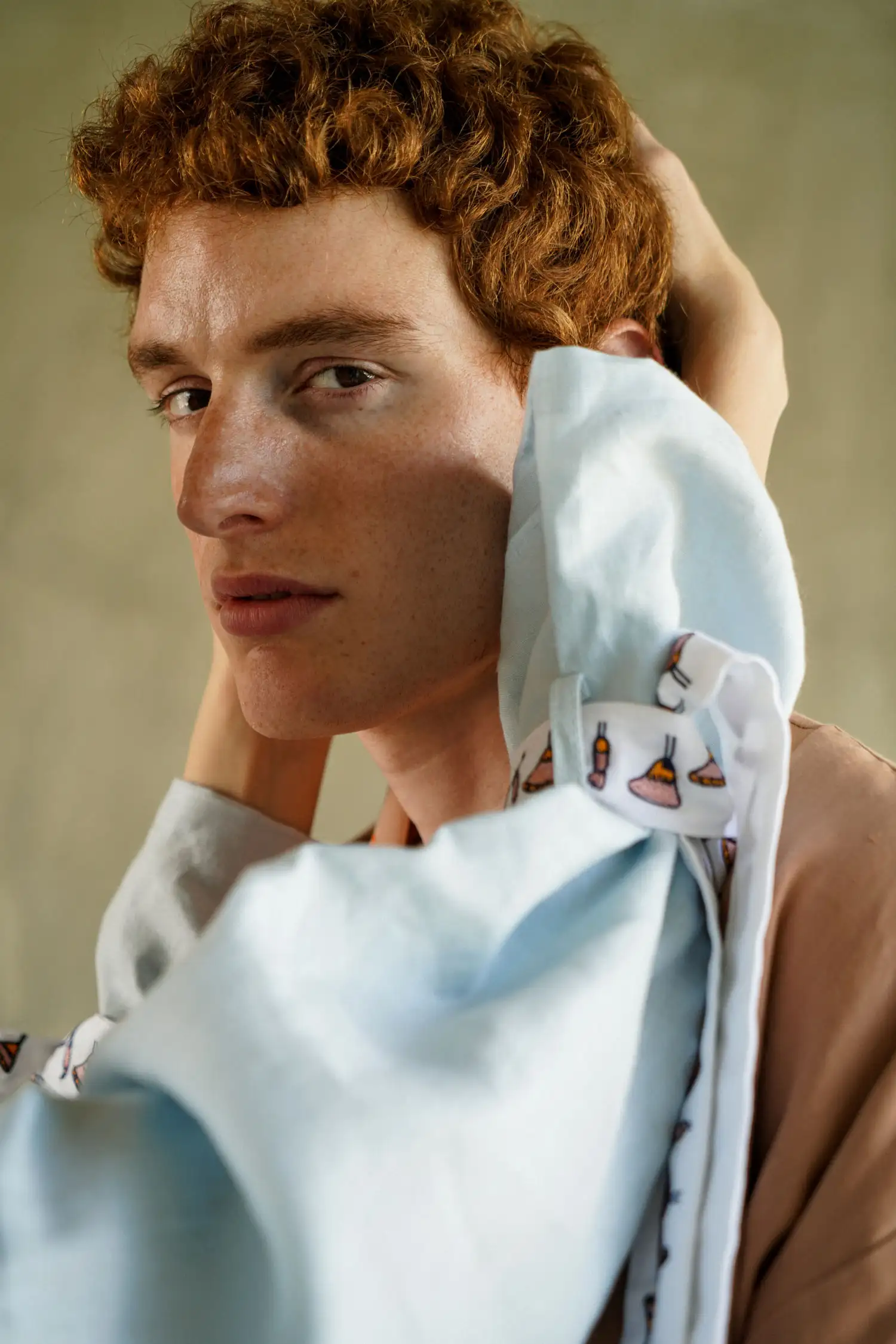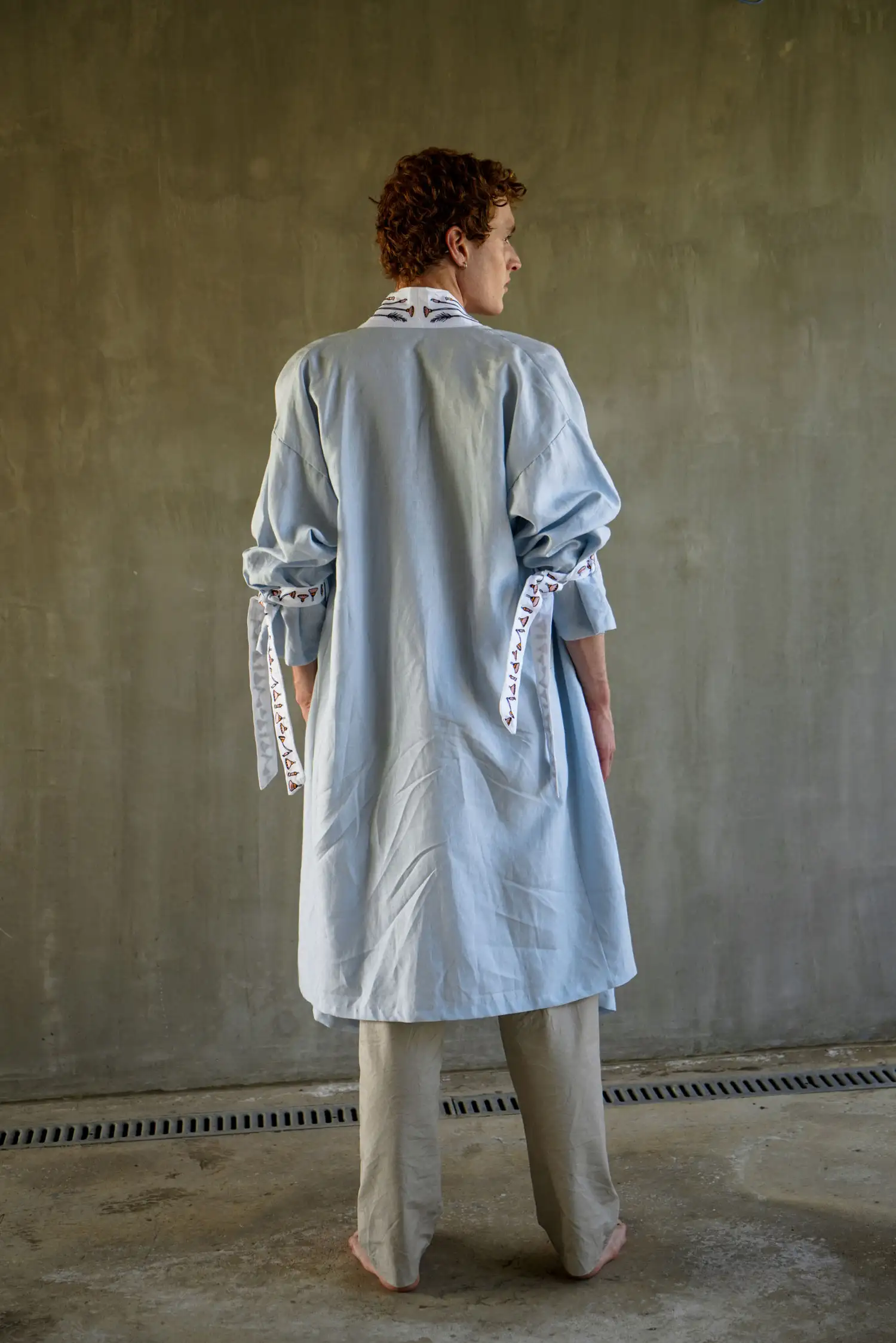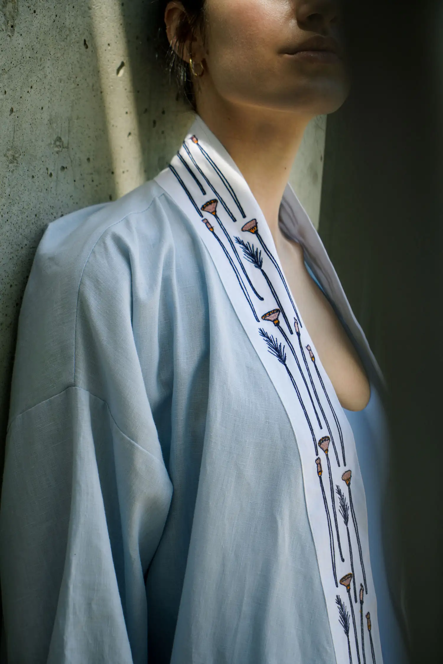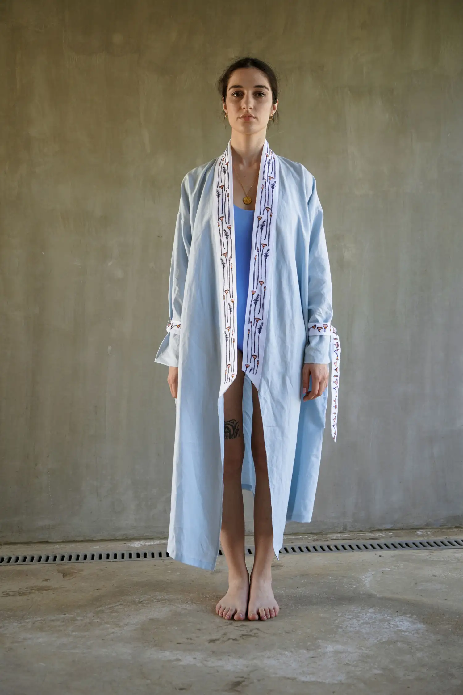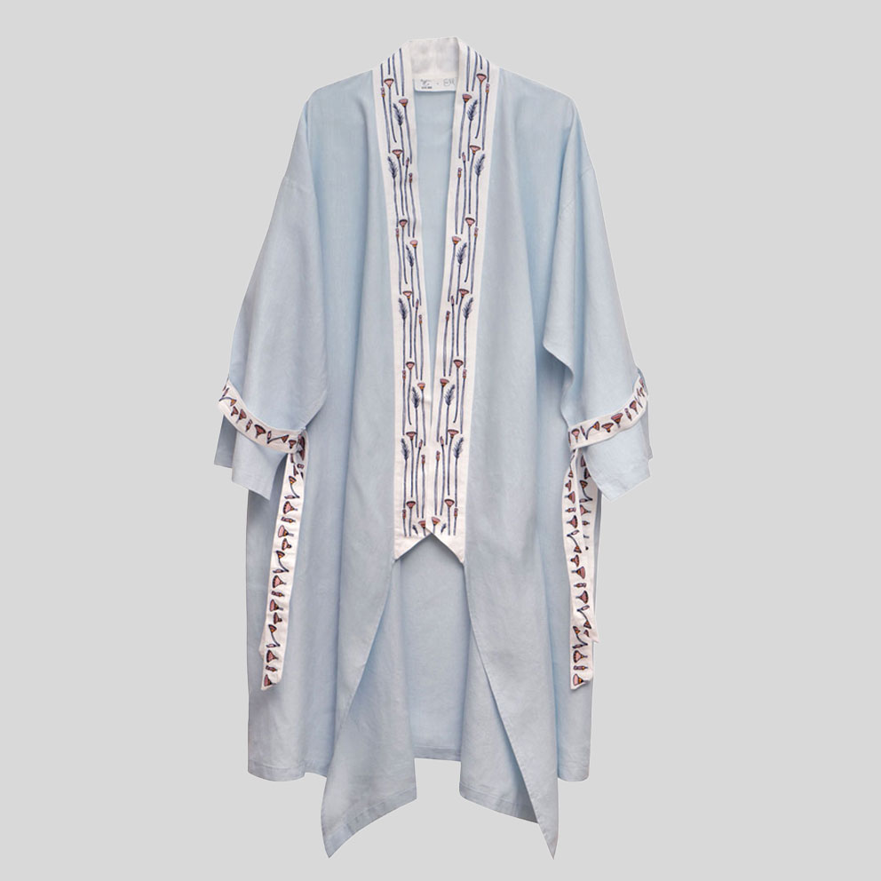 Papyrus kimono style linen robe is what relax-wear dreams are made of. This kimono can be worn open ended to portray a relaxed look. The designs are embroidered for a chic finish.