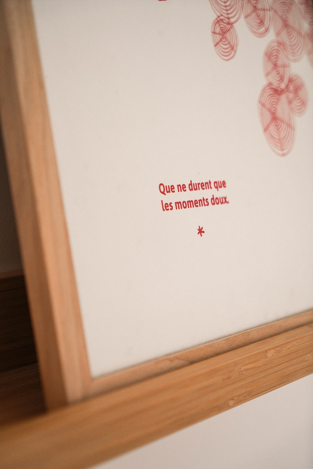 Que ne durent que les moments doux, because we want only good moments in our homes. This minimalist print is silkscreened on a beautiful Arches paper, and is a perfect gift to your wall, or to your friend’s who just moved into a new flat, or to this other friend who just got married.