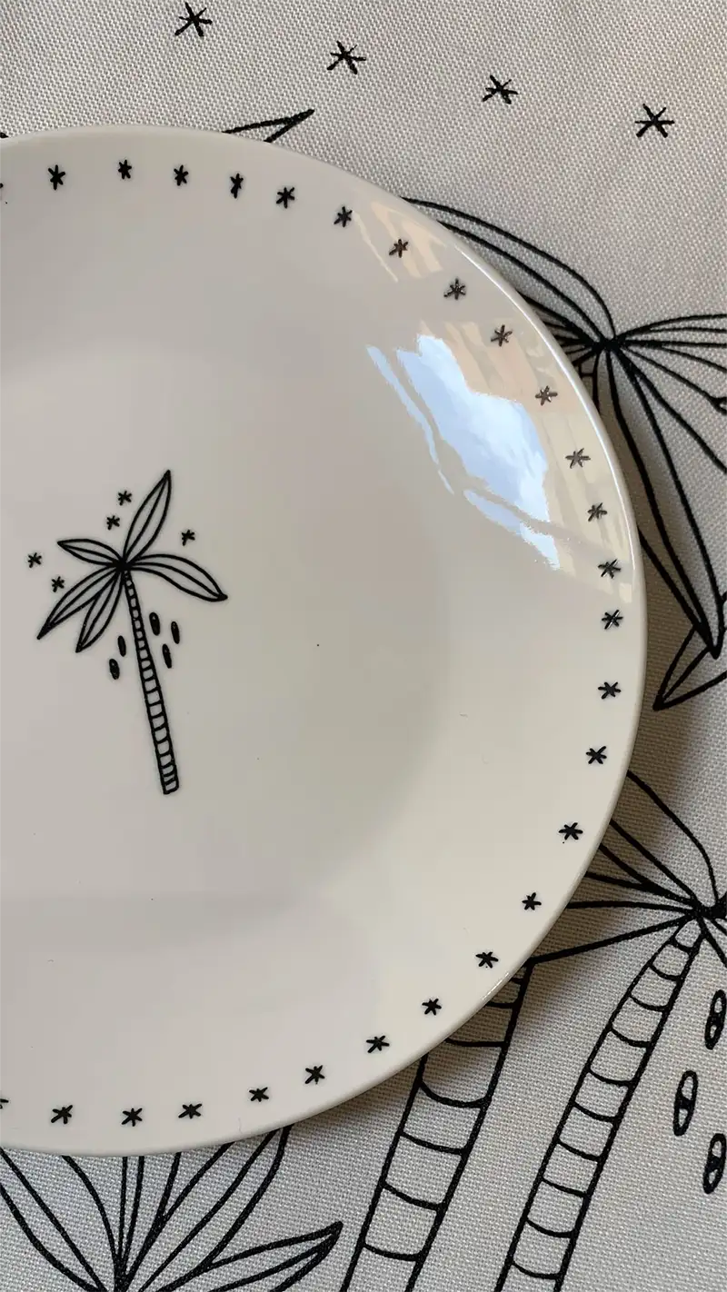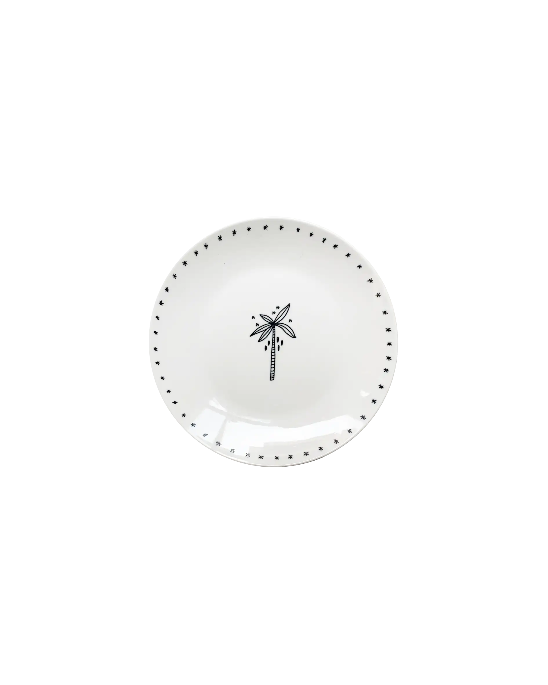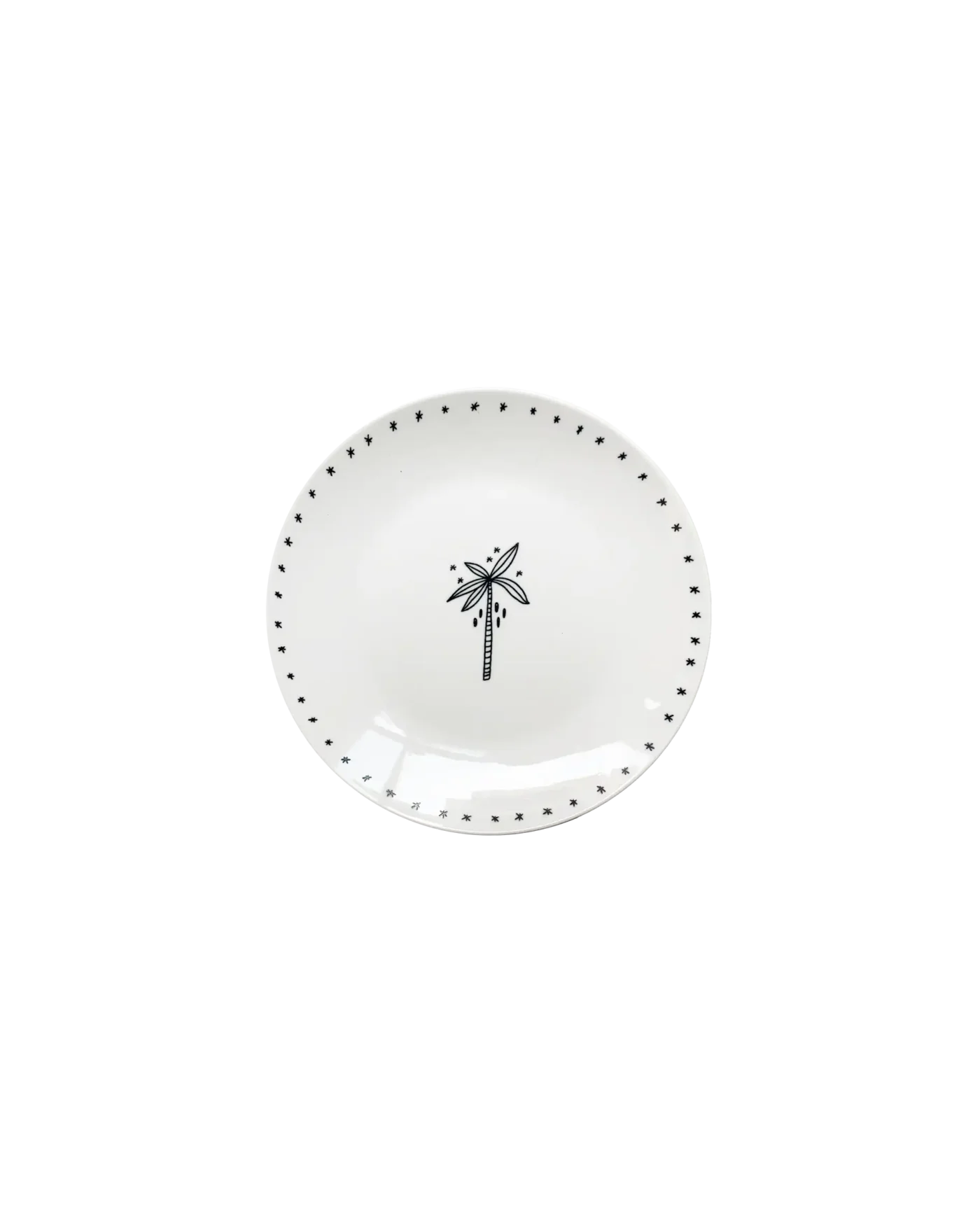 A 15cm diameter porcelain mini plate, embellished with our palm illustrations and a delicate star pattern forming a necklace around the edges, highlighting its contents. It is hand-printed in Beirut with talented local artisans